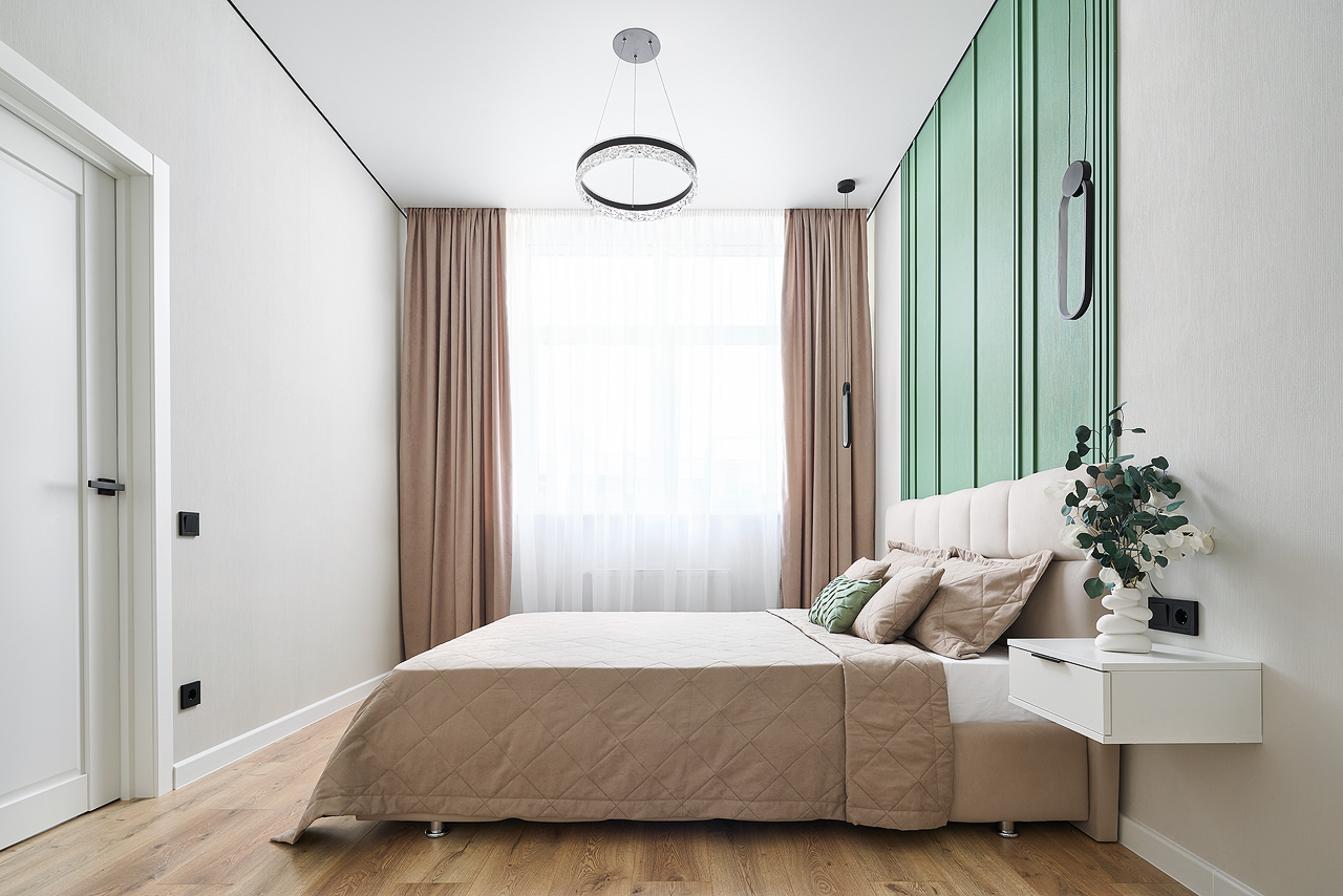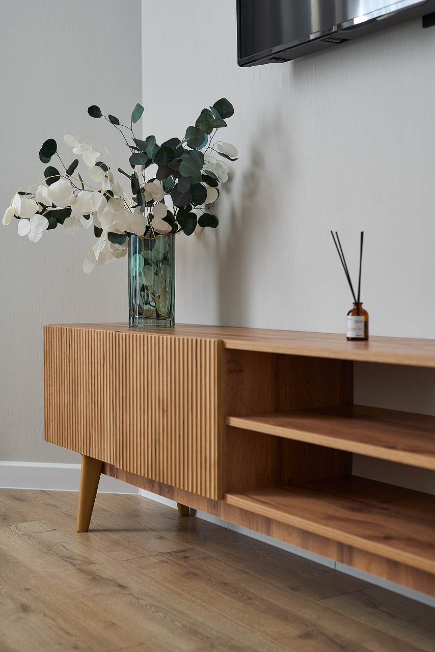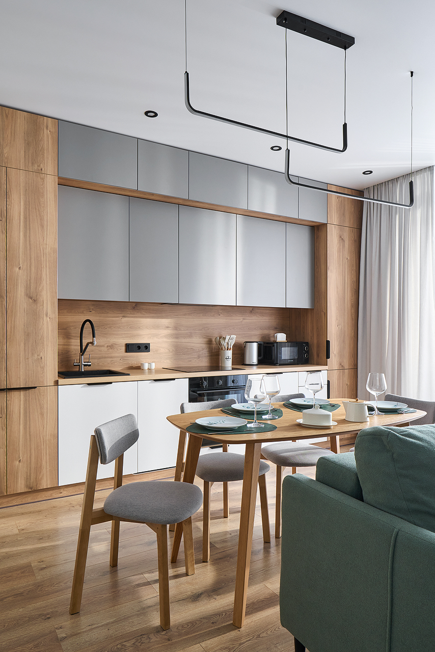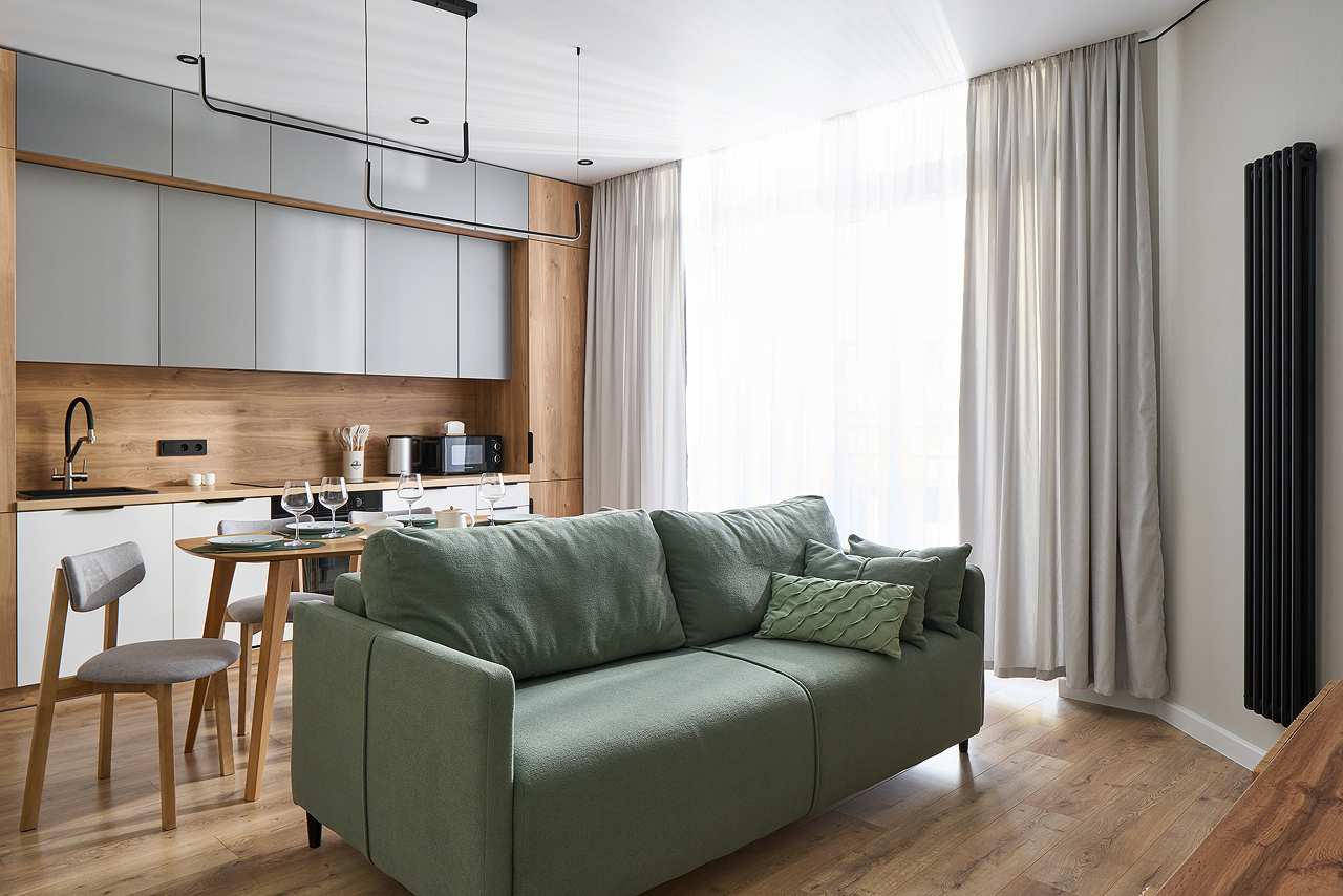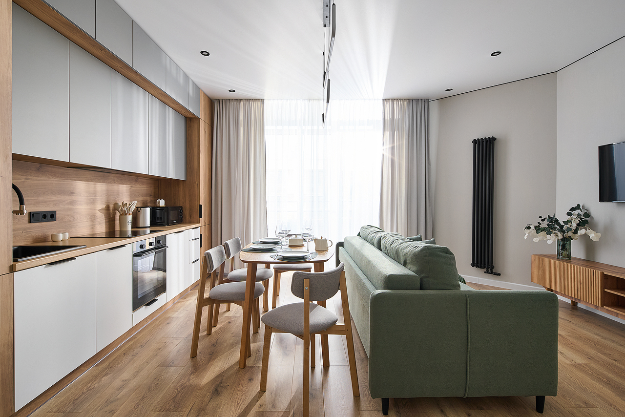 Просторная 1-комнатная квартира (47 м²) с большим балконом и тихим видом во двор. Интерьер в натуральных тонах дерева с оливковыми акцентами создаёт атмосферу уюта и отдыха.